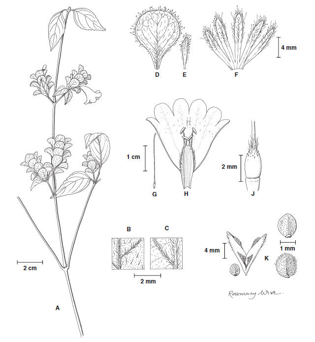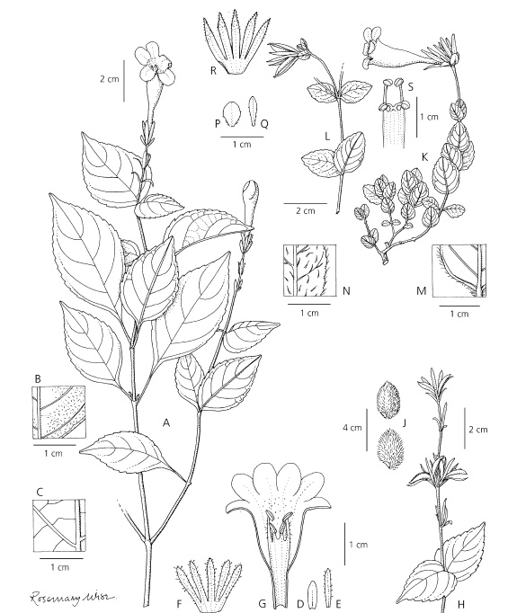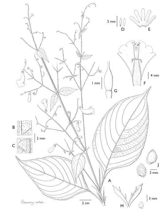 New and little-known species of Strobilanthes (Acanthaceae) from India and South East Asia 作者:J. R. I. Wood, R. W. Scotland 文献:Kew Bull. 64(1): 41 (fig. 20A-J). 2009. 形态描述:Anisophyllous perennial 30-60 cm high. Stem weakly quadrangular, sulcate, glabrous. Leaves unequal, the smaller about two thirds the size of the larger but similar in shape; petiolate; petioles 0.5-2.5 cm long, glabrous; lamina 3-9 × 1.7-4 cm, elliptic, acute, attenuate and slightly decurrent at the base, glabrous, margin weakly serrate, upper surface with prominent cystoliths, lower surface much paler. Inflorescence of terminal spikes 2-10 cm long, the flowers in 1-5 distant opposite pairs, 1-2 cm apart; rachis glandular pilose; inflorescence bracts at base of spike leaf-like but sessile or almost so, ovate, rounded at the base; floral bracts 5-6.5 × 2 mm, ovate-elliptic, obtuse, glandular-pilose, ± persistent; bracteoles 8 × 1 mm, oblong-oblanceolate, obtuse, glandular-pilose, persistent until after anthesis; calyx 10-11 mm long at anthesis, accrescent to 15 mm in fruit, lobes linear, obtuse, glandular-pilose, the posterior three lobes united for 3 mm above the base at anthesis, becoming free in fruit, the central lobe slightly longer than the others and becoming subspathulate, the two anterior lobes free to the base; corolla 3.7-4 cm long, pale violet with a white tube, glabrous, straight, the basal cylindrical tube c. 11 × 2.5 mm. then gradually widened, reaching 12 mm at the mouth, lobes 9-10 × 7 mm, ovate, rounded; stamens 4, didynamous, all fertile, included; filaments very sparsely pilose, erect, the 2 shorter c. 2 mm long, the 2 longer c. 4 mm long; anthers 2 × 0.5 mm, oblong, erect, muticous; pollen not examined; style pilose. Capsule 1.5 cm long, glabrous except for a few glandular hairs at the apex; seeds 4, 3 × 2.5 mm, lenticulate, pilose with mucilagineous hairs, almost lacking an areole. Fig. 20A-J. 分布:Myanmar (Indo-China, Asia-Tropical); Yunnan 性质:sp. nov. |