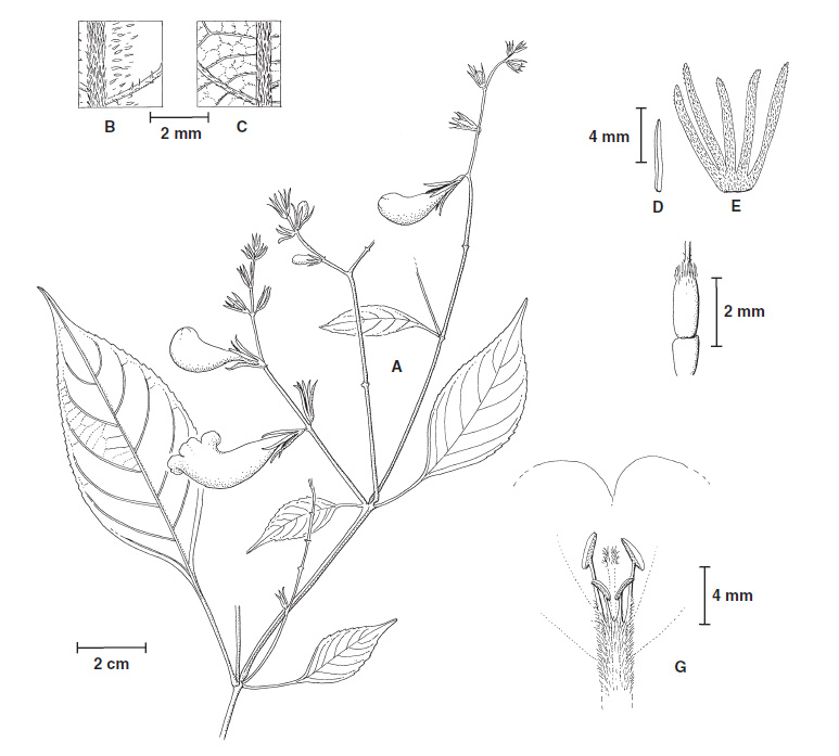 广西爵床科植物新资料 作者:方鼎, 罗献瑞, 唐恢天 文献:Guihaia 17(1): 29 (1997). 形态描述:Frutex c.2 m altus;rami flexuosi , bisulcati , fere glabri .Folia opposita , inaequalia ;lamina chartacea ,lato -elliptica vel elliptica raro ovato -elliptica , major 13-18 cm longa , 6-9 cm lata , minor 4-7.5 cm longa, 1.6-3.3 cm lata , apice acuminata vel caudata , basi lato -cuneata raro obtusa , margine in dimidio superosparsim crenulata , supra atrovirens , subtus in sicco plus minusve ferruginescens , ut rinque cystolithis densis lineolatis, costa fere glabra , nervis lateralibus ut rinsecus 9-12 (major)vel 6-7 (~10)(minor)ut rinqueprominulis , venulis transversalibus;petiolus 0.5-3 cm longus , canaliculatus , fere glaber .Inflorescentia axillaris, 1-2.5 cm longa , spicata , interrupta , 3-1 -flora ;pedunculus 2-4 mm longus ;bracteaeoppositae ,ellipticae vel oblongae , c .3.5-4 mm longae , 2 mm latae , alterae 1 -florae , alterae eflorae , persistentes ,cum bracteolis segmentisque calycis coriaceae ciliolatae apice obtusae ut rinque cystolithis ;bracteolae oblongaevel ellipticae c.7 mm longae , 2.5 mm latae ;caly x 9 mm longus , bilabiatus , labio antico fere ad basin 2 -partito, labio postico 3 -fido , lobulis c .4 mm longis , omnibus oblongis ;corolla 3-3.5 cm longa , paulo curvata ,extus glabra , tubo 6 mm longo cylindrico , fauce purpurea campanulata c .1.9 cm longa , limbo albenti 5 -lobato, lobis c .5 mm longis apice 2 -lobulatis;stamina 4 , didynama , inclusa , filamentis anticis 8 mm longisposticis 2 mm longis omnino sparsim hirsutis , thecis 3-4.5 mm longis ;ovarium glabrum , ut roque loculoovulis duobus continens , stylus c .1.8 cm longus , dense hirsutus.Capsula non visa 分布:Guangxi 性质:新种 |