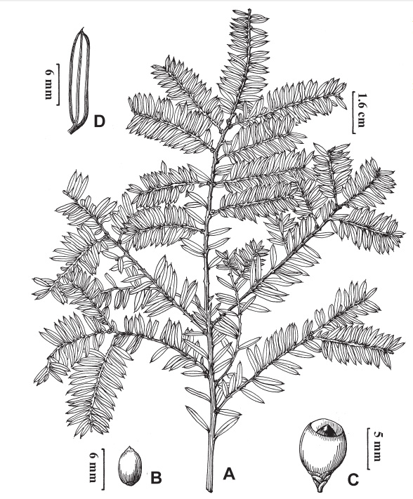 Notes on Gymnosperms I. Taxonomic Treatments of Some Chinese Conifers 作者:Li Nan, Fu Li-kuo 文献:Novon 7: 263 (1997) 形态描述:Trees or shrubs. Branchlets green, drying pale brown-yellow, golden or pale brown in the first year, aging pale or red brown. Winter buds ovoid; scales at base of shoots keeled abaxially. Leaves densely arranged in 2 irregular rows, spreading V-shaped, linear, (1.2—)2.5-3.7 cm X 1.5-2.5 mm, slender, straight, upper parts almost as broad as the lower parts, margin ± revolute, apex abruptly pointed. Seeds cylindric-oblong, ca. 6.5 X 4.5-5 mm, some-what compressed, with slightly obtuse lateral ridges in upper parts, apex obtuse and with a mucro, en-closed for more than 1/2 length in a cup-shaped, red succulent aril; hilum ellipsoid. 分布:Xizang 性质:新种 |