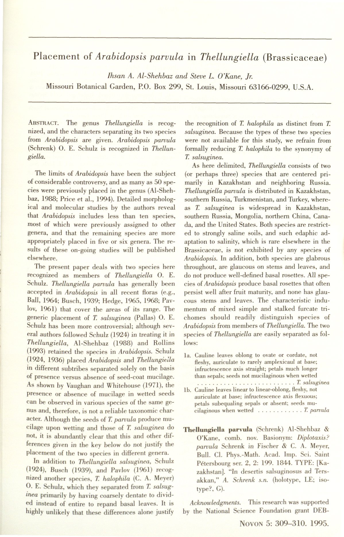 Placement of Arabidopsis parvula in Thellungiella (Brassicaceae) 作者:Ihsan A. Al-Shehbaz and Steve L O'Kane 文献:Novon. 5(4): 309 (1995). 分布:新疆 哈萨克斯坦、乌兹别克斯坦、土库曼斯坦、俄罗斯、中东地区。 性质:新组合 |