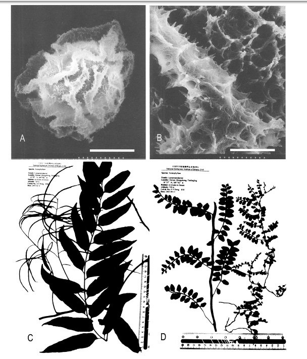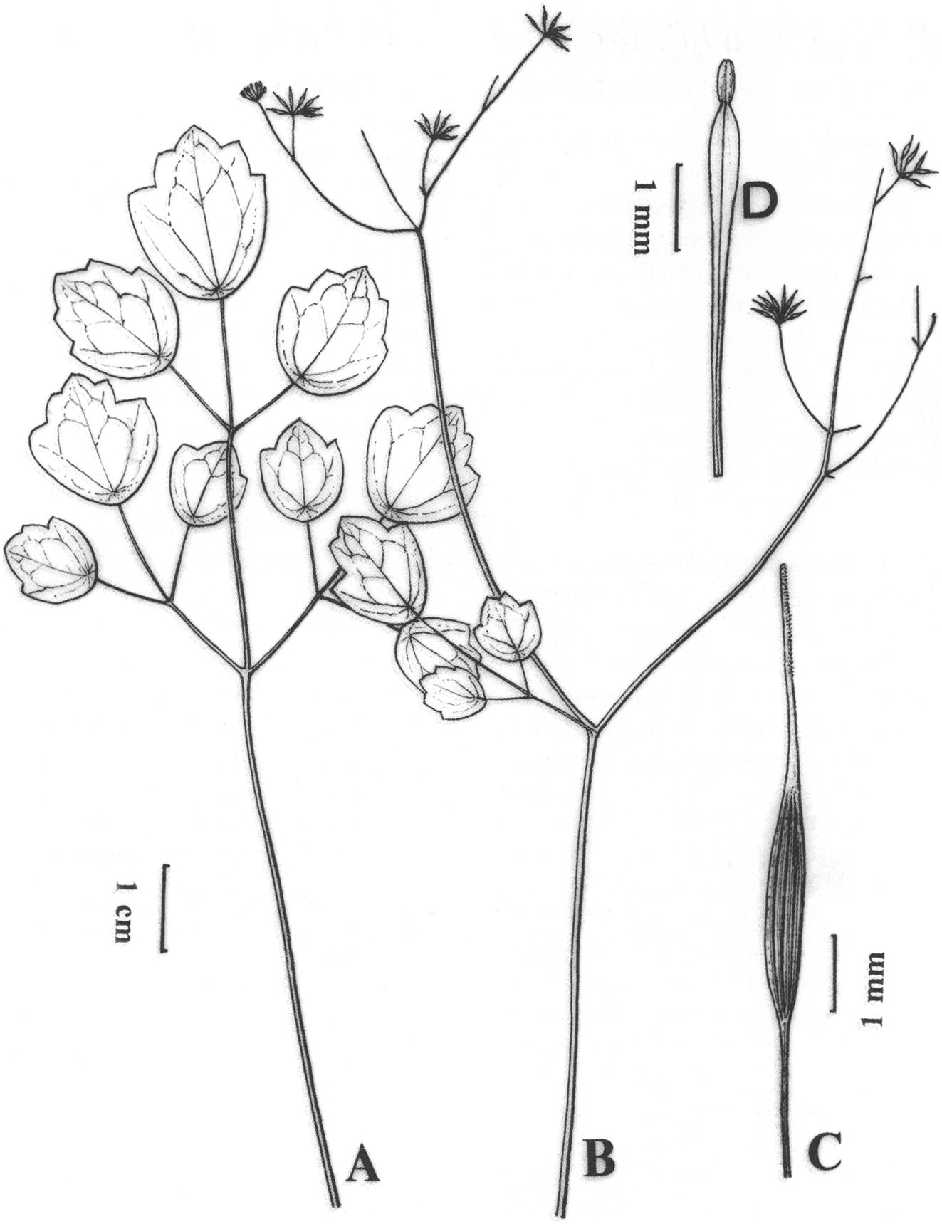 Thalictrum pseudoichangense (Ranunculaceae), a New Species from Guizhou, China 作者:Qiner Yang, Guanghua Zhu 文献:Novon 14(4): 510 (509-512; fig. 1). 2004. 形态描述:Herbs perennial, glabrous; stems 2 15-25 cm hu. A. Basall eaf. B. Floweringb ranch. C. Achene. tall witha fewd istall zranches.Ba sal eaves2; pet-ole 4-5 cm long;l ea£b lade2-or 3-ternateS 12 x ca. 5 cm;l eafletss lightlyp eltate, thinlyh erba-ceous, obovate, widelyo vateo r suborbicular0. 8-2 x 0.71.5 cm, apexs lightlyo btuseo r rounded, base subrounded, trilobed;lo be marginsto othed; nervesf lat on boths urfaces; petiolule1.7-3 cm long;c aulinele avesc a. 3 similarto theb asalo nes but smaller?ca. 4 x 1.5 em. Inflorescencemo no-chasial;p edlcnesl endervca. 5 mml ongeF lowers withs epalsc aducous;st amens ca. 6 mml ong;a n-therse lliptic,c a. 0.5 mml ong;f ilamentscl avate, graduallydi latedu pward,ap exo blanceolate; car-pels 5 to 6, long-stipitate;sty less ubeqtsalingov a ries, ca. 3 mm long, ventrallyi ndistinctlys tigmatic in upper part. Achene body fusiform, ca. 3 mm long, veins ca. 8; stipe slender, ca. 2 mm long. 分布:Guizhou 性质:sp. nov. |