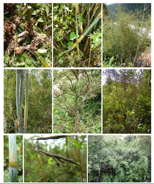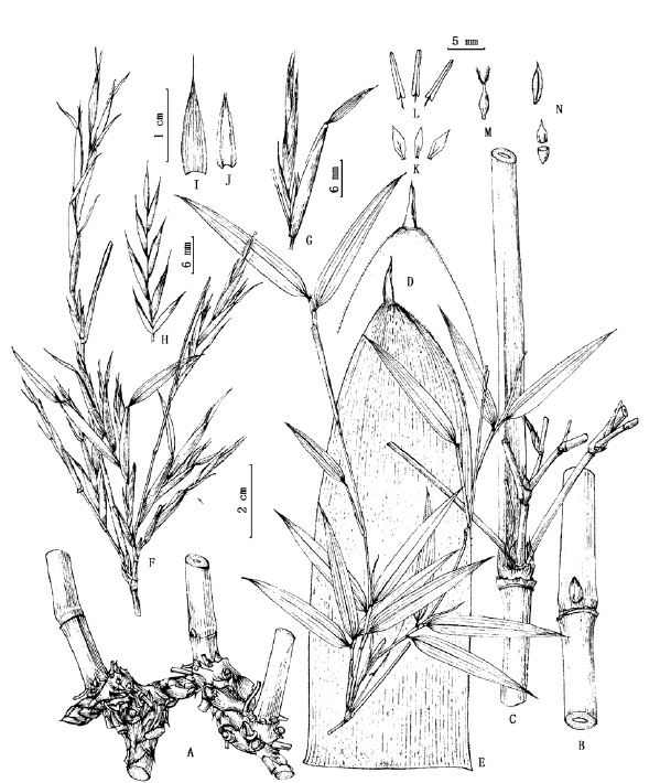 西藏筱竹属一新种和错那箭竹补充描述 作者:易同培, 史军义, 马丽莎 文献:Acta Phytotax. Sin. 45(5): 686 (-690; figs. 1-2). 2007. 形态描述:地下茎合轴型, 秆柄长1.5-4(5) cm, 直径1-2 cm。秆丛生, 高3-5 m, 直径1-1.5(2)cm, 梢端直立; 节间圆筒形, 但在分枝一侧下部扁平或具小沟槽, 长(6)20-25(30) cm, 绿色, 幼时密被白粉, 无毛, 平滑, 秆壁厚2.5-4(5) mm, 髓锯屑状; 箨环隆起, 初时被淡黄褐色小刺毛或无毛; 秆环稍隆起, 初时常为紫色; 节内高3-4 mm。秆芽三棱状长卵形, 细瘦, 贴生。秆每节分枝1-5枚, 几平展或斜展, 长15-45 cm, 粗1-2 mm, 几平展或斜展。箨鞘早落, 长约为节间长度的1/2, 革质, 长圆形, 先端短三角形, 背面被灰黄色瘤基刺毛, 边缘密生灰黄色纤毛; 箨耳缺失, 鞘口繸毛3-5枚, 灰黄色, 直立, 长达4 mm, 易掉落; 箨舌斜截平形、斜弧形或截平形, 高不及1 mm, 被灰黄色小硬毛, 边缘密生纤毛; 箨片在秆下部者直立, 上部者外翻, 三角形或线状披针形, 长0.8-3.3 cm, 宽2-4 mm, 无毛,全缘。小枝具叶3-6枚; 叶鞘淡绿色或紫色, 无毛, 边缘无纤毛; 叶耳缺失, 鞘口繸毛1-3枚, 褐色或淡褐色, 每枚常在中部分裂为3-5枚细繸毛, 易脱落; 叶舌紫色, 截平形, 高约0.5 mm, 边缘初时具繸毛; 叶柄长1-1.5 mm, 无毛; 叶片线状披针形, 长2.5-7.2 cm,宽3.5-7 mm, 纸质, 先端渐尖, 基部楔形, 无毛, 下面灰绿色, 次脉(1)2对, 小横脉组成长方形, 边缘具小锯齿而粗糙。笋期6月。花枝无叶, 纤细, 常在基部具1枚先出叶和佛焰苞状叶鞘。总状花序生于花枝上部各节的1枚大型佛焰苞内, 其佛焰苞远较节间为长, 长2-2.7 cm, 宽4-6 mm, 紫色, 无毛,顶端具1枚缩小叶, 内面仅包藏1枚小穗; 小穗柄长约1 mm, 向轴面扁平, 无毛; 小穗含5-6朵小花, 长2.5-3.2 cm, 稍两侧压扁, 淡绿色, 顶端小花不孕; 小穗轴节间近轴面扁平,无毛, 长2-3 mm; 颖片0-2枚, 无毛, 狭长披针形, 先端细长渐尖, 第一颖长8-10 mm, 宽1.5-2 mm, 具5脉, 第二颖长8.5-11 mm, 宽1.8-2.3 mm, 具7脉; 外稃披针形, 长1-1.5 cm,无毛, 先端细长渐尖, 具(5)7-9脉; 内稃狭窄, 长0.5-1 cm, 先端2齿裂, 脊上具纤毛, 脊间具2脉, 脊外每侧各具2脉; 鳞被3, 膜质, 披针形, 后面1片较小, 长约1.5 mm, 边缘具很短的纤毛; 雄蕊3, 花药紫色, 长5-8 mm; 子房椭圆形, 长约1 mm, 无毛, 花柱1, 柱头2, 羽毛状。颖果线状长圆形, 紫色, 平滑, 长6-7 mm, 直径1-1.5 mm, 有腹沟, 先端具宿存花柱; 胚乳白色。花期、果期8月。 分布:Tibet: Nyalam(聂拉木) 性质:sp. nov. |