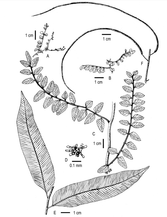 Teratophyllum hainanense (Lomariopsidaceae), a New Species from Hainan Island, China 作者:Dong Shi-Yong, Zhang Xian-Chun 文献:Novon 15(1): 104 (-108; figs. 1-2). 2005. 形态描述:Rhizomes dark brown, 3-4 × ca. 2 mm, apex covered with scales; scales brown, lanceolate, ca. 8 mm. Sterile fronds: lower, juvenile fronds (bathyphylls) asymmetrically pinnate, more pinnules on basiscopic side, 3-10 × 0.5-1.5 cm; rachis narrowly winged; pinnules flabellate to ovate-rhomboid, 0.5-1.5 × ca. 0.5 cm, base basiscopically cuneate, acroscopically subtruncate, margin crenate, apex rounded, both surfaces scaly, scales substellate; mature sterile fronds (acrophylls): stipe stramineous, 8-13 cm, swollen at base, rachis straw-colored, not winged, rachis and stipe scaly, scales brown, adpressed, substellate, ca. 0.2 mm in diam.; lamina pinnate, 50-65 × 18-23 cm, pinnae 8-11 each side, all articulate, with stalks 2-7 mm, oblong-lanceolate, 11-16 × 2.5-3.4 cm, papery, sparsely scaly scales as in bathyphylls, base basiscopically cuneate, acroscopically rounded or rounded-truncate, margin entire or slightly crenate, apex long acute; veins free, forked once or twice, reaching margin or within 0.2 mm of margin. Fertile fronds with stipe 5-8 cm; lamina pinnate, ca. 30 × 15-20 cm; pinnae ca. 10 pairs, with stalk ca. 6 mm, linear, 13-18 cm × 0.8-1.5 mm. Sori acrostichoid, apparently covering entire pinna. Spores globose; perispore folded echinulate. 分布:Hainan: Qiongzhong Co., N slope of Mt. Tiedingling 性质:sp. nov. 模式引证:Hainan: Qiongzhong Co., N slope of Mt. Tiedingling, alt. 720 m, 18°57'10" N, 109°42'19" E, S. Y. Dong 818, 2003-04-11, holotype: PE, isotype: L,isotype MO ,isotype P ,isotype PE |