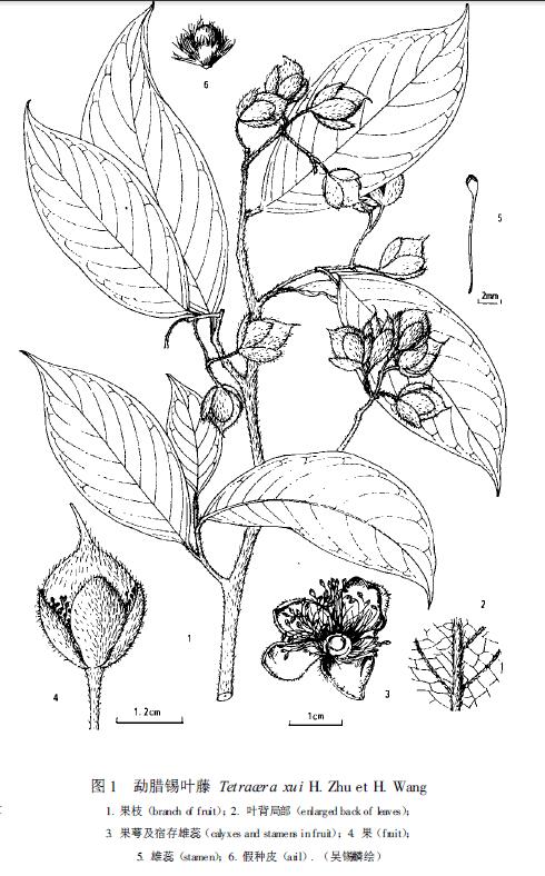 文献:Guihaia 19(4): 337, f. 1 (1999). 形态描述:攀援木质大藤本, 枝密被柔毛。叶革质, 椭圆形, 长11-13 cm , 宽4-5.5 cm , 顶端短尾尖, 基部宽楔形至圆形, 边缘全缘, 上面无毛,下面仅脉上被毛, 侧脉每边7-11 ,中脉和侧脉上面凹入, 下面隆起,被糙毛, 小脉在下面明显;叶柄长4~5 mm , 背面密被糙毛。花序少花, 长约2-3 cm , 花梗长约1 cm ,花序梗和花梗均密被柔毛。花萼4 ,卵形, 在果期长达1.5 cm , 外被柔毛, 内面无毛;雄蕊多数, 长达1 cm , 果卵形, 长1.5-2 cm , 被柔毛, 具长约5 mm的喙;假种皮流苏状, 长6-7 mm 。果期8 月 分布:Yunnan 性质:新种 |