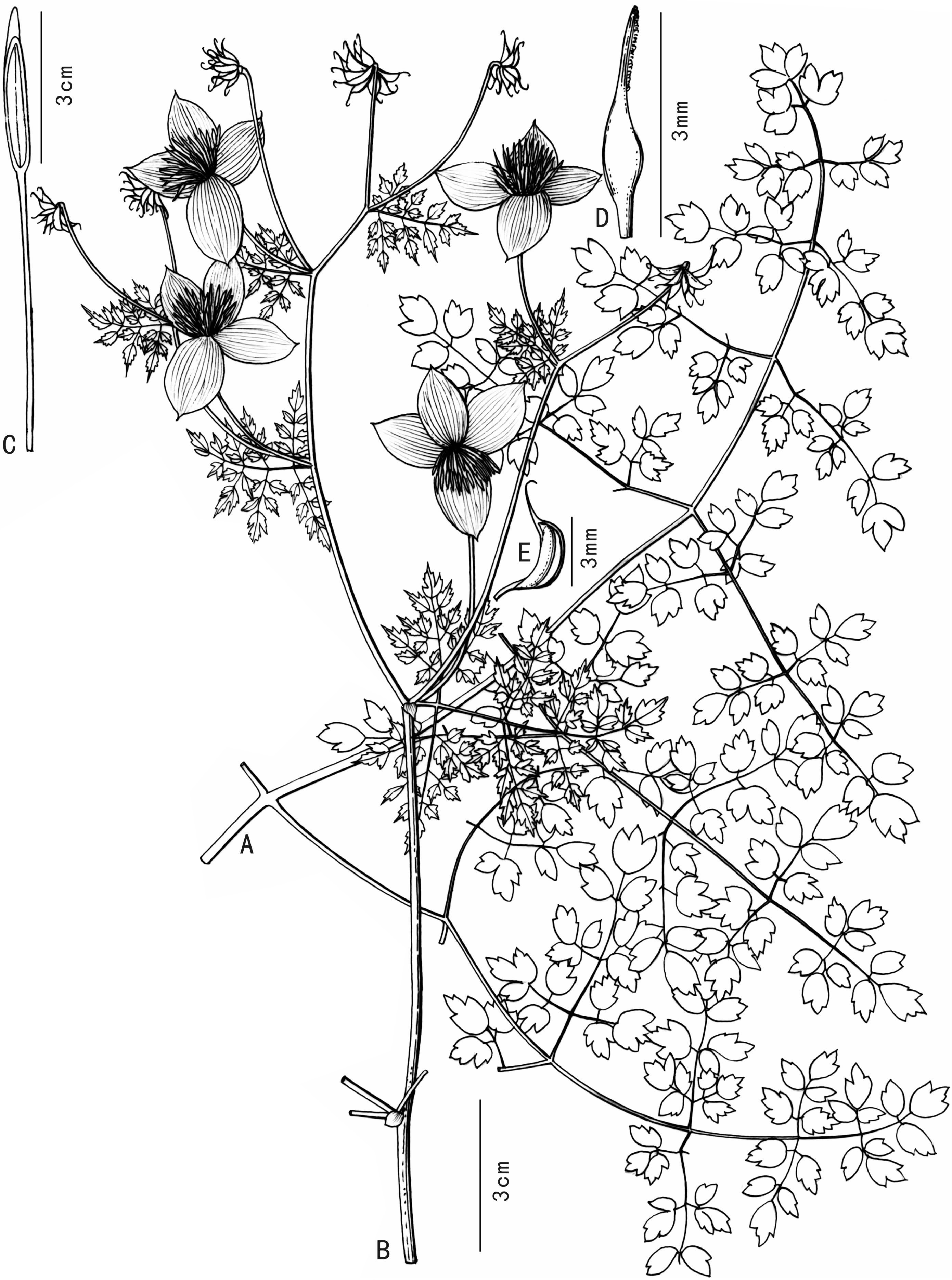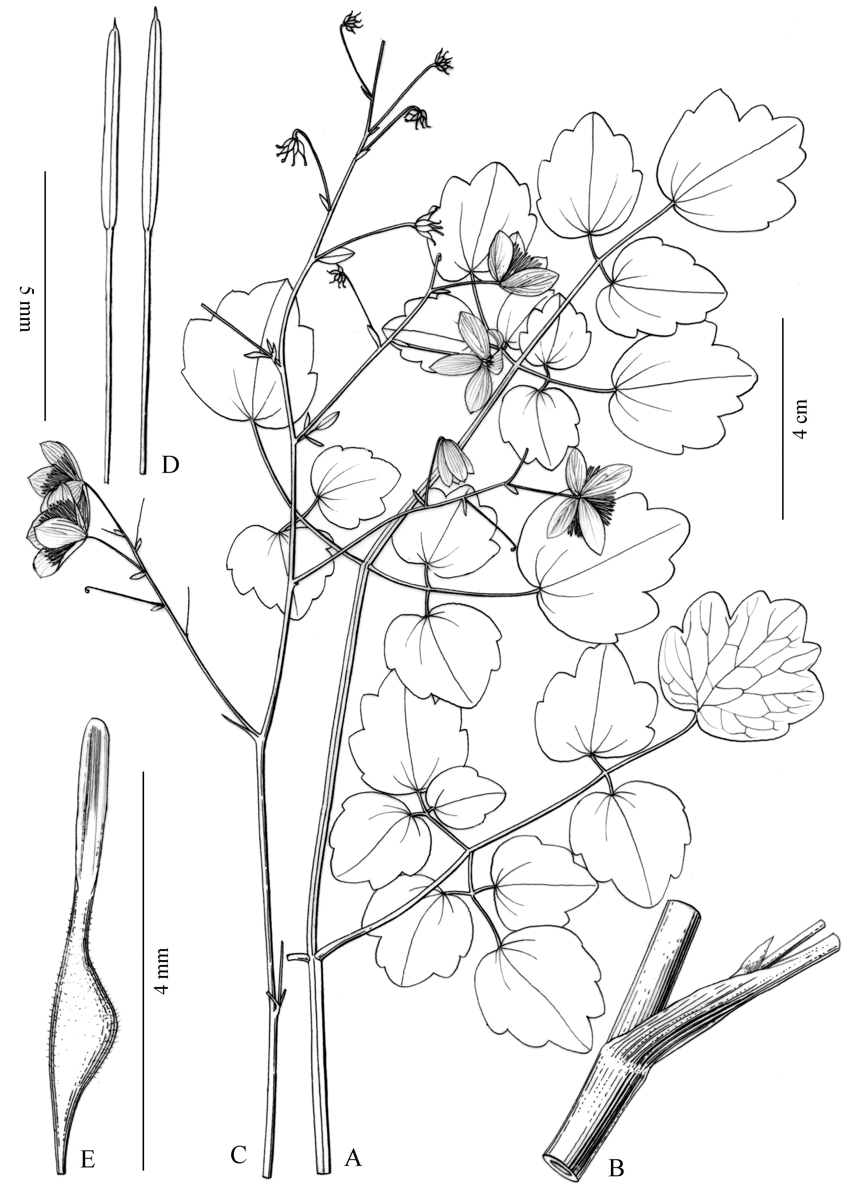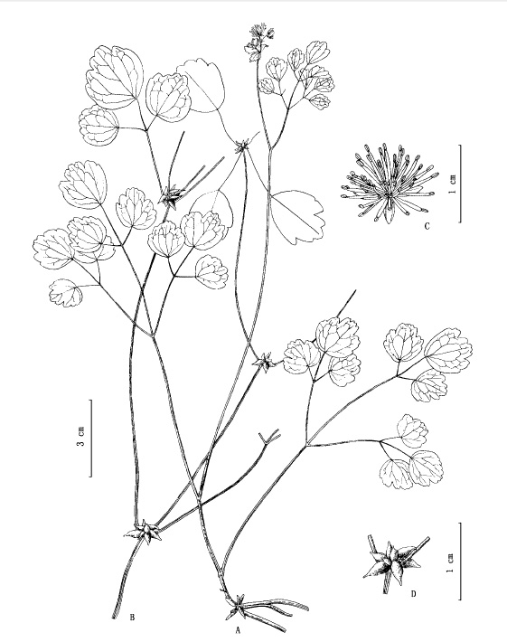 文献:Acta Phytotax. Sin. 35(3): 262 (1997). 形态描述:Plants 17--70 cm tall, glabrous. Stems branched, erect. Leaves both basal and cauline; stipules leaflike, 1--6 mm, membranous; petiole 0.8--15 cm; leaf blade 1- or 2-ternate, 5--10 cm; petiolule 0.5--1.2 mm; leaflet blade orbicular or cuneate-obovate, 0.7--2.2 × 0.7--2.9 cm, papery, base cordate, margin 3(--9)-lobed; lobes crenate, apex obtuse or sometimes very shortly mucronate; veins abaxially prominent, adaxially inconspicuous. Inflorescence terminal or axillary, paniculate, several flowered. Sepals 4, early deciduous, white, obovate, 3.7--4.2 mm. Stamens ca. 30; filament whitish, 2.4--2.7 mm, apex strongly dilated, narrower than anther; anther ca. 1--1.2 mm, apex obtuse. Carpels (5--)9--15; style 1.5--2.2 mm; stigma conspicuous. Achenes shortly stipitate; body narrowly cylindric-ovoid, 2.5--3 mm; persistent style straight to circinate, 0.2--0.3 mm; veins 6--8, stout. Fl. Jun--Aug, fr. Sep--Oct. 分布:Yunnan(云南): Lancang(澜沧) 性质:sp. nov. |