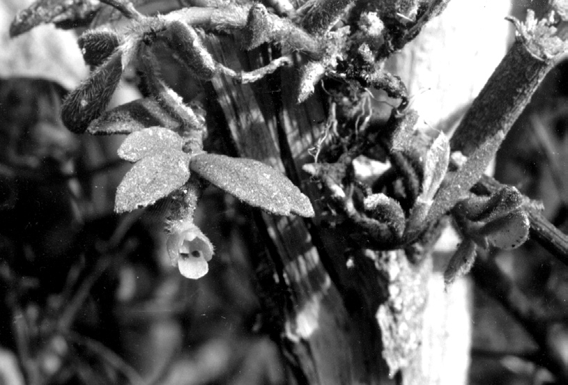 Trichotosia dongfangensis (Orchidaceae), a new species from China 作者:Xiaohua Jin & Gloria Laiping Siu 文献:Ann. Bot. Fenn. 41(6): 465 (-466; figs.). 2004. 形态描述:Epiphytic. Rhizome creeping, branched, ca. 1.5 mm in diam. Stems about 1 cm apart, 3-8 cm long, with 5 to 7 rather small leaves closely arranged in two rows. Leaves fleshy, oblong to lanceolate, acuminate, about 10 ¥ 5 mm, with a dense cover of white hairs all over, including sheaths. Inflorescence lateral, single-flowered. Floral bracts 4, subulate, hairy, 1-3 ¥ 1 mm. Peduncle 4 mm long. Pedicel and ovary 1 mm long. Flower yellowish green; sepals coarsely hairy on the outside; dorsal sepal narrowly elliptic, 3 ¥ 2 mm, obtuse; lateral sepals unevenly triangular, 5 ¥ 3 mm, truncate; petals 2.5 ¥ 1.5 mm, lanceolate, glabrous, acute; lip fleshy, entire, tongue-shaped, rounded, hairy, slightly concave at base, with a semi-globose callus at base and two purple callosities in center, 7 ¥ 3 mm. Column semi-terete, 1.2 mm long, column-foot 4 mm long. Pollinia 8, ovate, yellow, 0.5 mm long. Fruit not seen. 分布:Hainan: Dongfang, Houming Mountains 性质:sp. nov. |