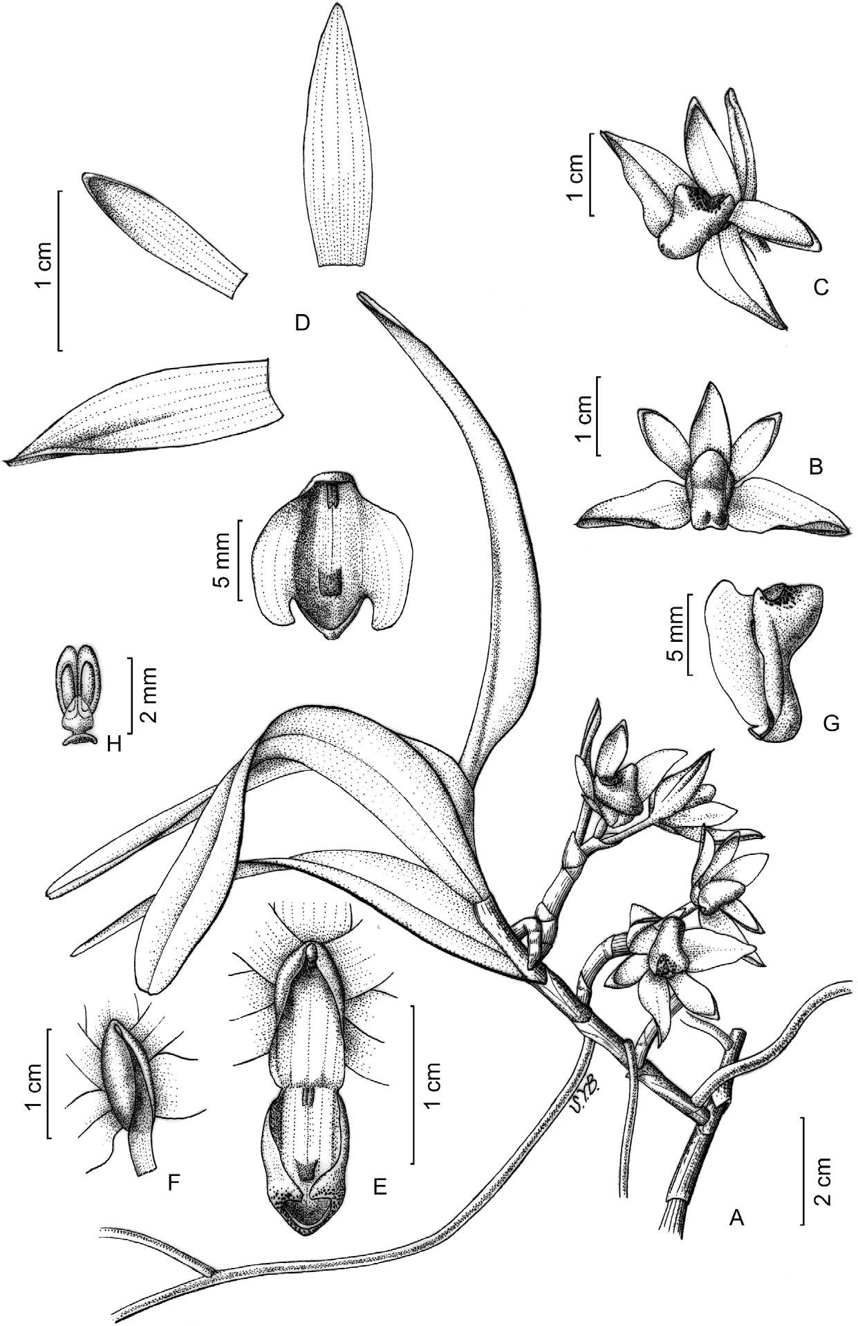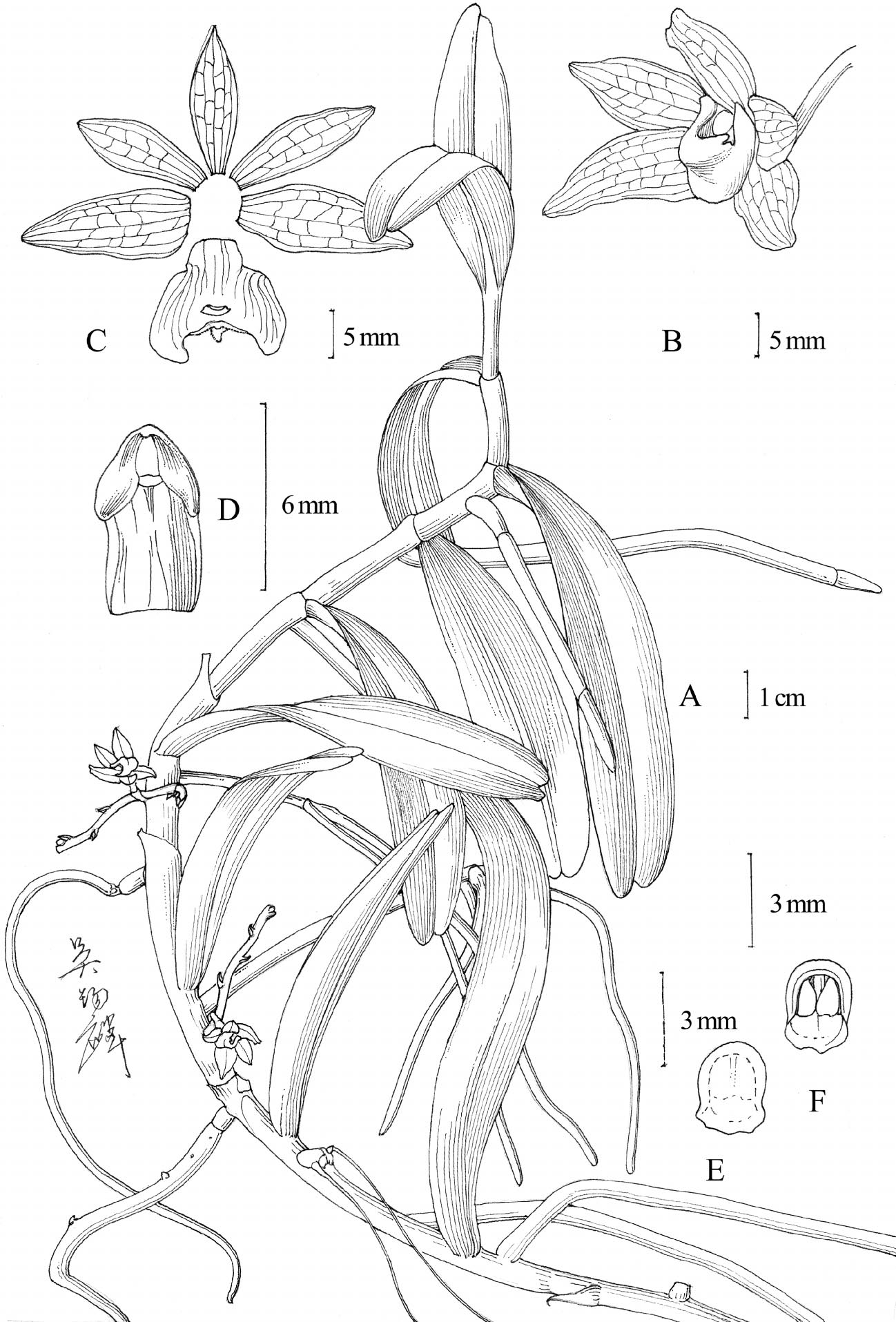 Thrixspermum odoratum (Orchidaceae), a new species from Hainan Island, China 作者:Xi-Qiang Song, Qian-Wan Meng, Yam Tim Wing, Yi-Bo Luo 文献:Ann. Bot. Fennici. 46: 595 (2009). 形态描述:Epiphytic herb. Stem erect or horizontallyspreading, stout, terete, 10–20 cm long, 3–4 mmin diameter. Internodes 1.2–1.5 cm long. Leavesdistichous, thick and fleshy, oblong, ellipiticto linear-oblong 8.5–11.5 ¥ 1.0–1.5 cm, apexunequally bilobed and obtuse. Inflorescencesracemose, extra-axillary, sub-erect or slightlypendant, usually 1–2-flowered, 1.2–1.5 cm long;rachis flattened, ca. 0.6 cm long; bracts broadlytriangular, dense and distichous, conduplicateconcave,apex acute, 2.5 ¥ 5 mm. Flowers large,with a strong jasmine fragrance, white, tinged with light yellow, borne in succession, usually 2flowers at a time, flowering more than two days,1.8–2 cm long, 1.2–1.3 cm in diameter, erector horizontally spreading; pedicel and ovaryabout 8–10 mm long, greenish; dorsal sepalellipitic, 1.6–1.8 ¥ 0.8 cm, margin entire, apexobtuse and 3-veined; lateral sepals obliquelyovate or ellipitic, 1.6–1.8 ¥ 0.9 cm, apex obtusewith a short tip, 5-veined; petals similar tobut slightly smaller than sepals, oblong-spathulate,1.4–1.6 ¥ 0.5–0.6 cm, apex obtuse andslightly concave, 3-veined; lip widely ellipsoid,pale yellow or yellowish, 1–1.2 cm in totallength, 1.2–1.4 cm wide, the base of lip shallowsaccate with a yellow irregular clump oran erect lamellum, 3-lobed; lateral lobes erect,short falcate, 7–8 mm long, 5–6 mm wide,apex obtuse-rounded, with brownish irregularstripes or blotches, midlobe 2 mm long, thick,conical, with densely brownish irregular stripesor blotches, disc brown-yellowish, the centerof disc with a single, arched, auriculate callus,callus 1.5 mm high, apex truncate. Column shortand broad, the column foot 4–6 mm long; anthercap whitish yellow; pollinia 4 in 2 pairs. Capsuleslinear-cylindric, 0.4 ¥ 3.0 cm. FloweringApril to May and fruiting May to August. 分布:Hainan: Changjiang 性质:新种 |