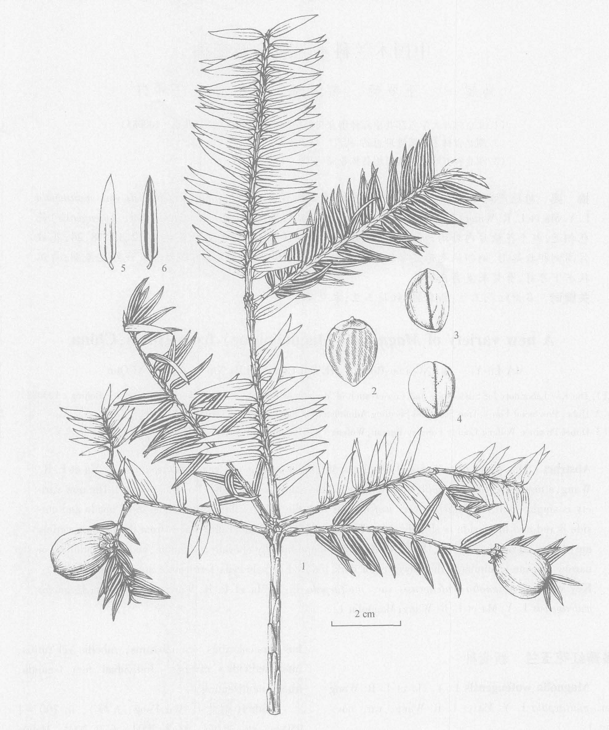 文献:Bull. Bot. Res. 15(3): 356 (1995). 形态描述:本变种与原变种的区别在于叶较长, 长2 一4.5 cm, 雄球花较大, 胚珠先端略呈暗红色, 骨质种子倒卵状圆锥形, 顶端圆, 有凸尖, 下部渐窄, 先端扁。 分布:Zhejiang 性质:新变种 |