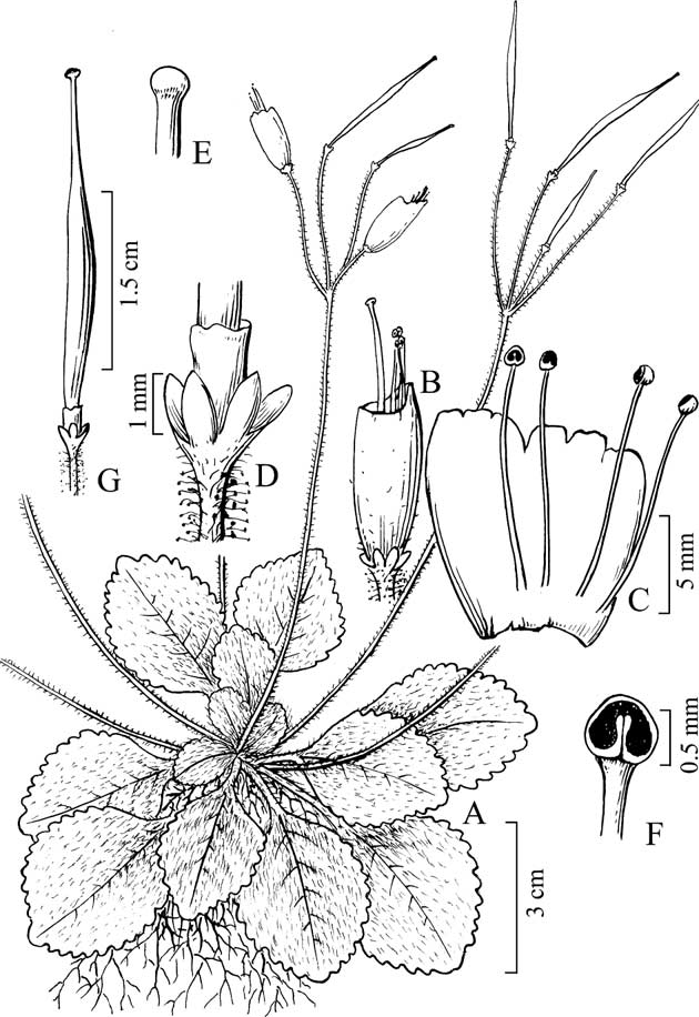 Tremacron aurantiacum var. weiningense (Gesneriaceae) var. nov. from Guizhou, China 作者:Shun-Zhi He, Qing-Wen Sun, Yun-Chao Li 文献:Nordic J. Bot. 28(2): 199 (-201; figs. 1-3). 2010. 形态描述:Perennial herb. Leaf blades all basal, widely ovate or ovate, 2.5-4.0 cm long, 1.8-3.3 cm wide, apex nearly circular, base broadly cuneate, margin crenate, upper surface with white villous and white appressed pubescence, lower surface with light-brown villous and white appressed pubescence, lateral veins 4-5 on each side of midrib, inconspicuous on the upper surface, prominent on the lower surface, with densely light-brown villous and white appressed pubescence; petiole 1-4 cm long, densely brown villous. Cymes 5-10, 2-branched, axillary, inflorescence 4-8-flowered. Peduncle 7-9 cm, with light-brown villous, white and glandular pubescence; free or sparsely 2 bracteolate. Pedicel 1.5-3.5 cm, light-brown villous. Sepal’s lobe obround ca 1.2mm-0.8 mm, apex obtuse, sparsely villous outside, glabrous inside. Corolla yellow, tubular, ca 1.2-1.4 cm, thinly lanuginose on both surfaces; corolla tube narrowly tubular, 1.0-1.2 cm-4-5 mm; upper lips indistinct and cut-like, ca 1.3 mm, 3 emarginate; lower lips ca 1.2 mm, 3-lobed, with nearly cut-like lobes, central lobe ca 1 mm, lateral ones ca 0.8 mm. Stamens 4 separated and exserted out of corolla after maturity, upper stamens ca 1.6 cm, adnate to corolla 1.5mm from base, lower stamens ca 1.4 cm, adnate to corolla 2.5 mm from base; filaments lanuginose; anthers ovate ca 0.7 mm long, thecae 2, parallel, confluent at apex; staminode 1, ca 1 mm long, adnate to corolla 1 mm from base. Disc ca 2 mm in diameter. Pistil glabrous. Ovary narrowly oblong, ca 1.3 cm long, ca 1 mm in diameter; style ca 7 mm, stigma 1, ca 0.7mm long, capitate, sparsely emarginate. Capsule oblong, ca 2.0-3.2 cm long, persistent style 5.7 mm. Seed fusiform, lightbrown, ca 0.6 mm long, seed coat with transversely reticulate sculpturing (Fig. 3), murus smooth. Flowering Aug-Sep. 分布:Guizhou: Weining Xian 性质:var. nov. |