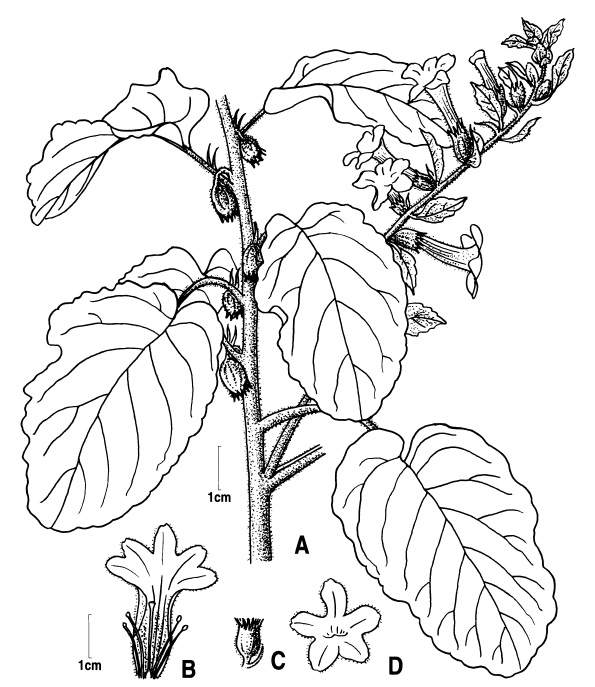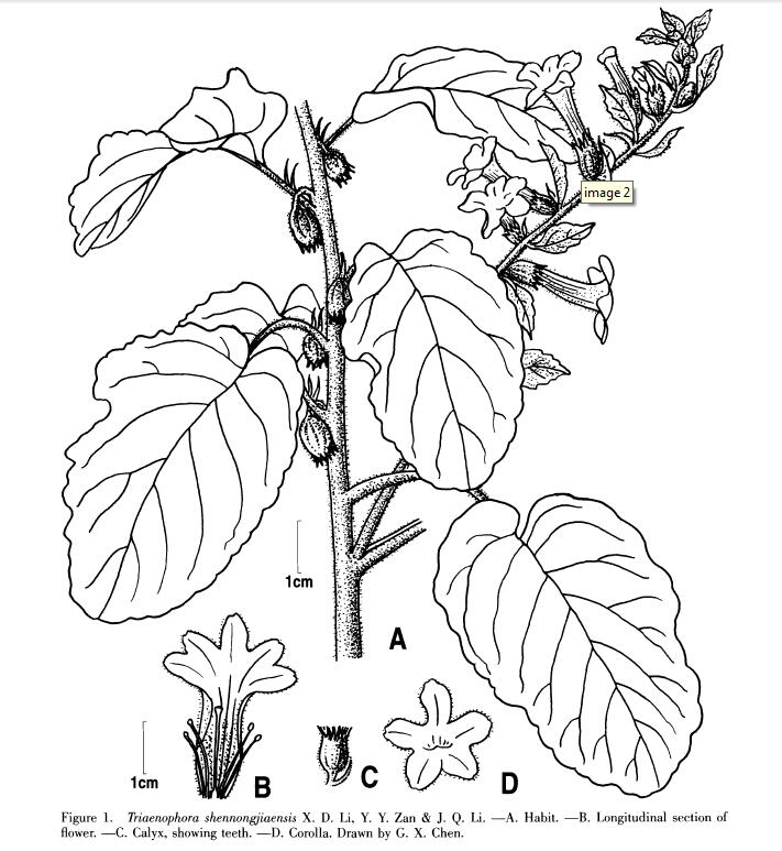 A New Species of Triaenophora (Scrophulariaceae) from China 作者:Xiao-Dong Li, Jian-Qiang Li, Yanyan Zan 文献:Novon 15(4): 559. 2005 形态描述:Perennial herbs, 10-60 cm tall, leaves and stems with sparse non-glandular and dense glandular hairs; roots pale yellow, fleshy, brittle; stem very short; leaves in a basal rosette, oblong to elliptic, 8-20 x 5-10 cm, densely glandular or pilose on both surfaces, base subcordate to cuneate, margins dentate, apex obtuse; petioles 3-6 cm long. Inflo- rescence racemose, main raceme suberect, lateral racemes prostrate, bracts in lower parts resembling basal leaves, 20-50 cm long, compact, 12- to 54- flowered; bracts similar to leaves but smaller, ob- long, margins dentate; pedicels 5-25 mm long; bracteoles 2 at middle of pedicels, linear, opposite, 3-20 mm long. Flower with calyx cylindrical, tube 5-8 mm long, erect, 5-lobed with each lobe 3- toothed, the teeth linear, irregularly acuminate, 6- 12 mm long; corolla pale yellow, 4-6.5 cm long, pilose abaxially, glabrous adaxially, corolla tube elongate, erect or slightly curved, 34.5 cm long, 1-1.5 cm diam., often with purplish red spots and glands within the throat, corolla 2-lipped, lobes with apices obtuse or rarely retuse, superior lobe separated by deeper sinuses, narrower, 2-toothed, 8-15 x 6-10 mm, inferior lobes 3-toothed, 8-15 x 4-8 mm; stamens 4, included, anthers 2-3 mm long; ovary ovoid, glabrous, ca. 3.5 cm long, styles included, stigma bifid. Capsules oblong, 8-15 x 8 mm; seeds numerous, minute, ca. 1 x 0.5 mm, oblong, laevigate. 分布:Hubei: Shennongjia Nat. Nat. Res., Panlong cavern 性质:新种 |