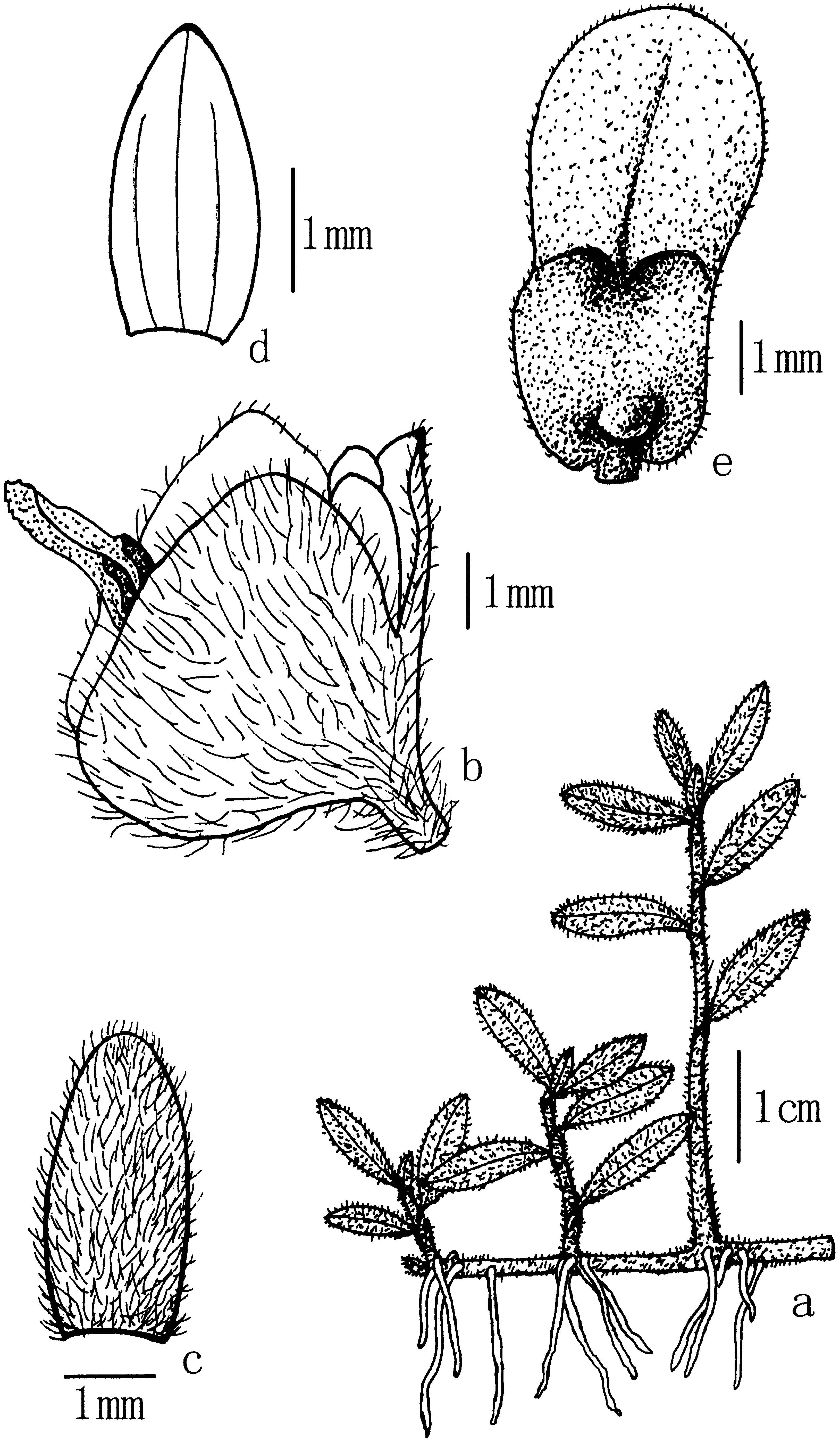 文献:Acta Bot. Yunnan. 19(3): 225 (1997). 形态描述:Herba annua.2~5 cm alta. Radices fibrosae numerosae tenuissimae brunneae.Caulorhiza elongata prostrata e nodis radices et 1~4 cauls emittentia Caulis erectus vel ascendens circ 0.5 mm crassus,saepe simplex,vifidis non numquam purpurascens.Folia opposita,linearia,3- 6 mm longa,circ 0. 5 mm lata, apice acuta,basi O 5-0.8 mm connata,marginne integra,utrinque viridula interdum purpurascentla,sessilia, Flos solitarius.axillaris.pedicellis circ 0.5 mm longis Calyx 0. 8~ l mm longus,4~ 5一partitas,lobis triangulatis.apse obtusis viridibus;petala 4~ 5 roseloa,Ionge ovata,1.4- 1.6 mm longa,0.5- O.8 mm lata,apiee obtusa;stamina 4~5, 0.7~ 0.8 mm longa filamentis tenuissimis,antheris minimis;squamae 4~ 5 minimae;carpella 4- 5.1onge ovata,circ 1. 5 mm longa,stylis brevissimis Folliculi erecti,apice paulo recurvi. Semina anguste oblonga,circ 0.5 mm longa,circ.0.2 lata,xerampelina,striis longitudinalibus. 分布:Yunnan(云南): Likiang, Yuhu(丽江,玉湖) 性质:sp. nov. |