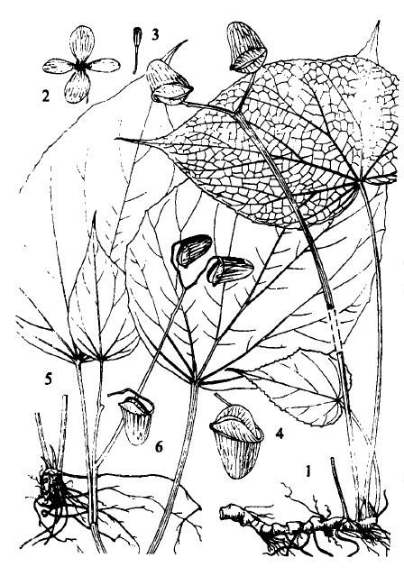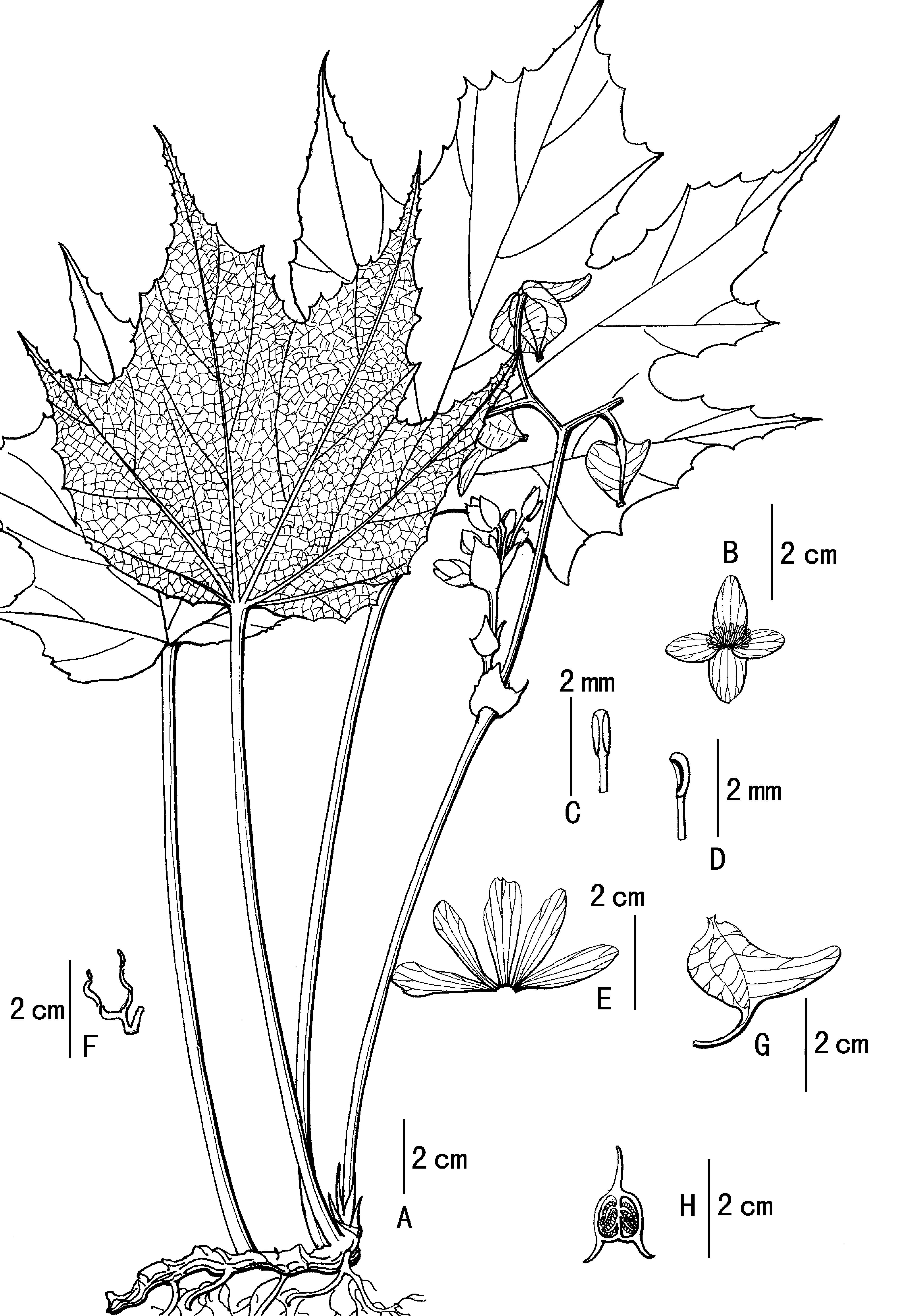 文献:Acta Phytotax. Sin. 35(1): 48, fig. 28 (1997). 形态描述:Herbs, rhizomatous. Rhizomes creeping. Leaves all basal, peltate, long petiolate; stipules caducous; petiole 4-8 cm, very sparsely villous; blade abaxially pale green, adaxially green with numerous white dots, ovate or broadly ovate, 4-8 × 4-5.5 cm, abaxially sparsely hirsute on major veins, adaxially sparsely hispidulous or setulose, basally 7-veined, tertiary veins weakly percurrent, base slightly cordate to rounded, margin serrulate or denticulate, apex acuminate or shortly caudate. Inflorescences axillary; peduncle ca. 21 cm, subglabrous; flowers several, pale purple, in dichasial cyme; pedicel 1.2-1.5 cm, glabrous; bracts caducous, ovate or suborbicular, 7-9 × 4-5 mm, margin remotely serrate. Staminate flower: tepals 4, outer 2 broadly ovate, ca. 1.2 × 1 cm, glabrous, base subrounded, apex rounded, inner 2 oblong, ca. 6 × 4 mm, apex obtuse, base broadly cuneate; stamens numerous; filaments 1-2 mm; anthers obovoid-oblong. Pistillate flower: tepals 4, outer 2 oblate-orbicular, inner 2 oblong; ovary oblong, glabrous, with 3 subequal wings, placentae parietal; styles fused at base. Capsule nodding, 15-16 × 4-5 mm. Fl. Feb-Apr, fr. Apr-May. 分布:Guangxi(广西): Donglan(东兰), Changdon(长东) 性质:sp. nov. |