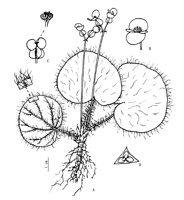 Four new species of Begonia from Guangxi, L. (Begoniaceae) China 作者:FANG Ding, WEI Yi-Gang, QIN De-Hai 文献:Acta Phytotax. Sin. 42(2): 177 (-178; fig. 4). 2004. 形态描述:Herb perennial acaulescent. Rhizome repent; villous,sometimes branching rooting at nodes,internodes 3一6 mm long 2一6 mm in diam.Stipules broadly or very broadly ovate 3一5 mm long; 3一6 mm wide; margin fimbriate; apex aristate.Leaves 2一5,basal;petioles 2一11 cm long densely villous when young and sparsely villous and brownish when old; blade papery or thickly papery; equally sided; reniform; 2一4.7 cm long; 3一8 cm wide base cordate or some-times suboblique; margin denticulate and ciliate(hairs 1一6 mm long),adaxially densely brown villous(hairs 7一13 mm long),and dark brown glandular when young; then glabrate; abaxially densely whitish puncticulate and very scatteredly dark brown glandular brown villous on the nerves, palmately 6一8-nerved palmate nerves together with lateral ones on both surfaces purpurate when young; soon above whitish.Scape arising from apex of rhizome 5.5一14.5 cm high; together with cyme glabrous or almost glabrous;dichasium 1一or 2-branched 2一4-flowered; bracts caducous. Tepals white inside reddish outside glabrous.Staminate flowers:pedicels 5一15 mm long; tepals 4; outer 2 suboblate; 9一10 mm long 11一13 mm wide inner 2 obovate; 6一7 mm long; 3一3.5 mm wide slightly obtuse; stamens numerous;filaments 1一1.5 mm long; anthers obovate; 1.2 mm long; connectives not extended.Pistillate flowers: pedicels 6一10 mm long; tepals 3,outer 2 suboblate; 6 mm long; 8 mm wide; inner 1 narrowly obovate; 5 mm long; 2.5 mm wide; slightly obtuse; styles 3,base connate; stigmas U-shaped; not contorted; papillate; ovary smooth triloculed; placentae axile; bifid.Capsule nodding ovoid 7 mm long glabrous,equally 3-winged wings subsemiorbicular; 5 mm long.Seeds numerous and minute.Flowering in April. 分布:Guangxi 性质:sp. nov. |
