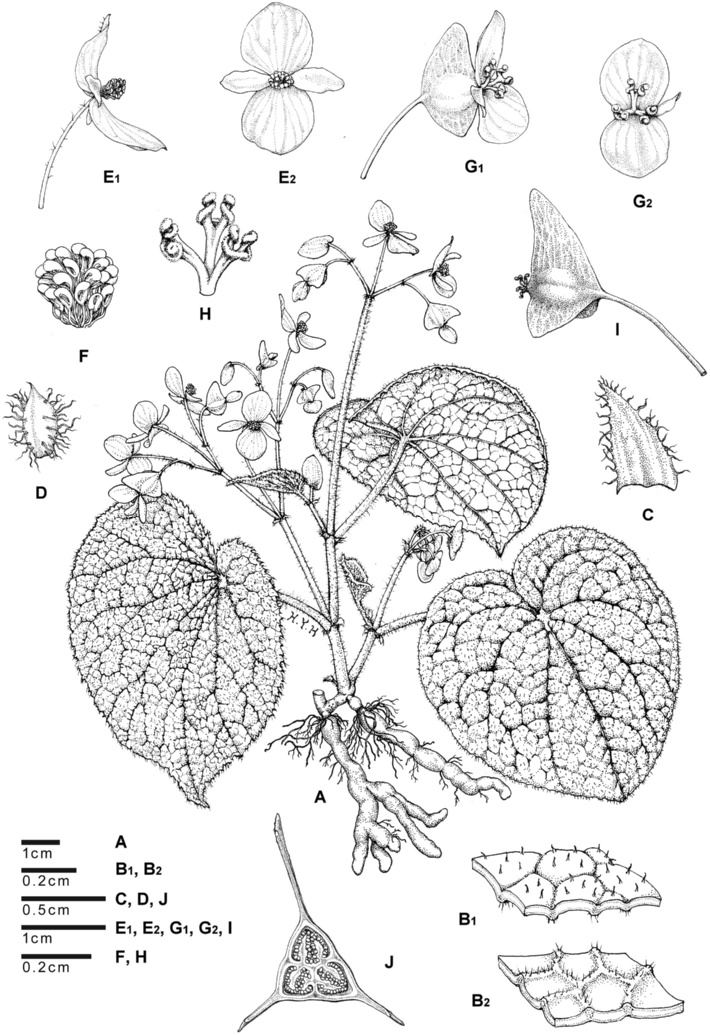 Begonia wuzhishanensis (sect. Diploclinium, Begoniaceae), a new species from Hainan Island, China 作者:Ching-I Peng, Xiao-Hua Jin, Shin-Ming Ku, Yoshiko Kono, Han-Yau Huang, Hsun-An Yang 文献:Bot. Stud. (Taipei) 55-24: 3. 2014. 形态描述:Herbs, monoecious, deciduous perennial, with elongate tubers. Tubers prostrate on soil surface or underground, to 7 cm long, 0.9 cm across, branched or unbranched. Stems erect, succulent, 0.3-0.5 cm across, to 20 (−25) cm high at anthesis, branched from lower nodes. Leaves alternate, petioles 2.5-4 cm long, 0.4 cm across; stipules triangular, margin fimbriate; leaf blade nearly symmetric, cordate, 3.5-8 cm long, 3-7.5 cm wide, chartaceous, adaxial surface green, slightly bullate, hirtellous, venation dark green and impressed, iridescent; leaf abaxial surface pale, veins reddish or red, manifestly elevated and hirtellous, margin irregularly double-serrate. Inflorescences axillary, dichasial cymes branched 2-3 times, peduncle 10-18 cm long, ca. 0.3 cm in diameter, hirtellous; lower bracts ovate, ca. 0.5 cm long, 0.3 cm wide, margin fimbriate, abaxially densely hirtellous, eventually deciduous. Staminate flower: pedicel sparingly hirtellous to nearly glabrous, 2-4 cm long, tepals 4, pinkish, outer 2 broadly ovate, ca. 1 cm long, 0.8 cm wide, abaxially glabrous to hirtellous, inner 2 lanceolate, ca. 0.8 cm long, 0.4 cm wide, glabrous; androecium zygomorphic, ca. 0.3 cm across; stamens ca. 25-30; filaments free, 0.1-0.2 cm long; anthers 2-locular, obovoid. Carpellate flower: pedicel sparingly hirtellous to subglabrous, 1.3-1.6 cm long, tepals 3, outer 2 broadly ovate to suborbicular, ca. 0.8 cm long, 0.8 cm wide, inner 1 lanceolate, ca. 0.6 cm long, 0.4 cm wide; ovary trigonous-ellipsoid, ca. 0.7 cm long, 0.5 cm across, white, glabrous, 3-winged, 3-locular; placentas septal; styles 3. Capsule nodding, ca. 1.6 cm long, 1.2 cm wide, wings unequal, triangular, abaxial wing ca. 1.2 cm tall, lateral wings ca. 0.4 cm tall, styles persistent. 分布:Hainan: Wuzhishan City, Fanyang Township, Nanyi Village 性质:sp. nov. |
