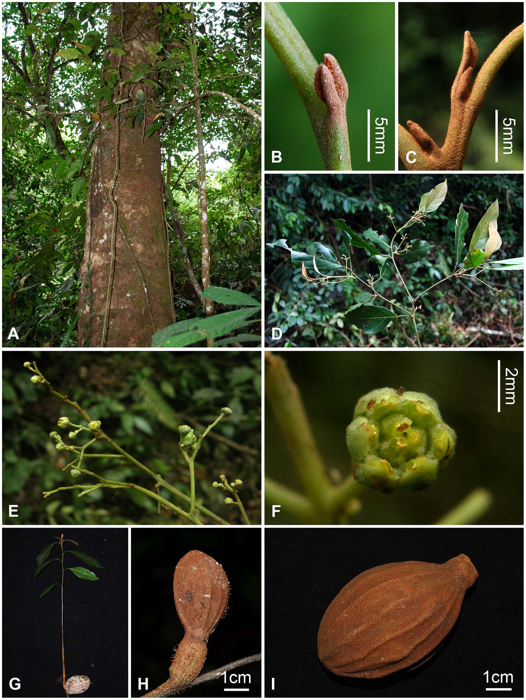 Beilschmiedia turbinata A Newly Recognized but Dying Species of Lauraceae from Tropical Asia Based on Morphological and Mole 作者:Bing Liu, Yong Yang, Lei Xie, Gang Zeng, Keping Ma 文献:PLoS ONE 8(6): e67636 (2). 2013. 形态描述:Trees, up to 25 m tall, to 1 m in DBH (diameter at breast height). Bark brownish gray. Branchlets 1.6-2 mm in diam., grayish brown, lenticellate, green, ferruginousbrown pubescent when young and blackish brown when dry. Terminal buds small type, 4-5 mm long, densely ferruginousbrown tomentose. Leaves alternate or subopposite; leaf blade broadly lanceolate, elliptic to elliptic-lanceolate, 7-12(216)62.2-4.2(26) cm, base broadly cuneate to obtuse, often oblique, apex caudate-acuminate, midrib elevated on both surfaces, lateral veins 4-6(27) pairs, immersed on upper surface but elevated on lower surface, minor veins slender, connected into fine type of minor venation pattern, covered with dense ferruginous pubescence on both surfaces when young, but glabrescent soon; petiole 1.4-2 cm long, densely ferruginous tomentose when young. Inflorescences paniculate; panicles terminal or axillary, 4.5-863-5.5 cm, few flowered; rachises slightly robust, sparsely ferruginous tomentose; bracts ovate, 2-3 mm long, caducous; flowers yellowish green, ca. 1.5 mm in length, 3 mm in diam.; pedicels 2-2.5 mm, sparsely tomentose; perianth lobes 6, ovate or broadly ovate, 1.261 mm, pubescent on both surfaces. Fertile stamens nine in three whorls, eglandular, subequal, ca. 1 mm long, filaments short but present and densely pubescent; anthers 2-celled, cells of the first and second whorls of stamens introrse, and those of the third whorl extrorse, the tip of anthers glabrous; staminodes of fourth series long-triangular and pubescent, ca. 0.6 mm long; pistils pyriform, pubescent, style short, ca. 0.3 mm. Each infrutescence usually bearing one single mature fruit; fruits maturing in two years. Young fruits of the first year ovoid, 2.5-361.5-1.8 cm. Mature fruits large and turbinate, 5.4-7.263.8-4.6 cm, apex obtuse, base attenuate, densely ferruginous-furfuraceous, having 16-20 irregular longitudinal ridges; fruiting pedicles conspicuously thickened and robust, 1.3-1.8 cm in diam. Young seedlings up to 40 cm in height, leaves alternate on the new sprout, the cotyledons retained for one or two years. 分布:Yunnan; Vietnam (Indo-China, Asia-Tropical) 性质:sp. nov. |