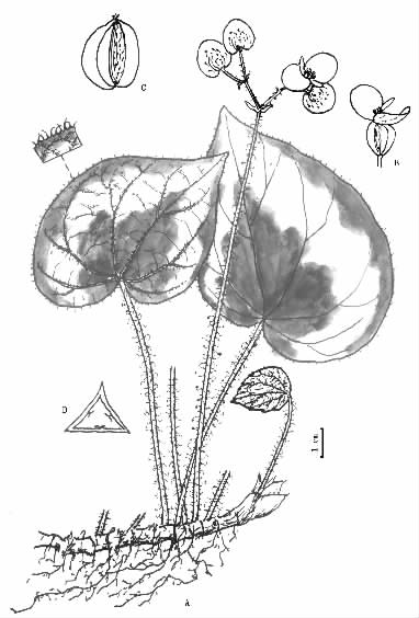 文献:Acta Phytotax. Sin. 40(4): 374, f. 1 (2002). 形态描述:Herbs rhizomatous. Rhizomes creeping, villous; internodes 5-10 mm. Leaves all basal; stipules broadly triangular, 3-4 × 3-4 mm, glabrous, apex acute; petiole 2-6 cm, villous; blade reniform to suborbicular, 4-6 × 7-11 cm, thickly herbaceous, abaxially villous on veins, adaxially glabrous, basally 3-5-veined, tertiary veins randomly reticulate, obscure, base cordate or shallowly so, margin irregularly repand, denticulate and ciliate, without a distinct apex. Inflorescence axillary, flowers 4 or 5 in dichasial cymes; peduncle 4-6.5 cm, glabrous; tepals pink. Staminate flowers: pedicel 6-7 mm, subglabrous; tepals 4, outer 2 larger, suborbicular, 7-8 × 5-6 mm, glabrous, apex rounded, inner 2 small, 7-8 × 2.5-3 mm; stamens numerous; filaments 0.6-0.7 mm, fused below into a short column; anthers oblong, 0.7-0.9 × 0.4-0.6 mm. Pistillate flowers: pedicel ca. 4 mm; tepals 3, outer 2 orbicular, 3-4 × 3-4 mm, inner 1 elliptic, 2.5-3 × ca. 1 mm; ovary 1-loculed with parietal placentae on upper part; styles 3, 1.4-1.5 mm. Capsule nodding, ellipsoid, equally 3-winged, wings triangular, 3.5-4.5 × 0.9-1.2 mm, apex obtuse. Fl. Aug-Oct. 分布:SE Yunnan(云南东南部): Maguan(马关),Gulinqing(古林等新田) 性质:sp. nov. |