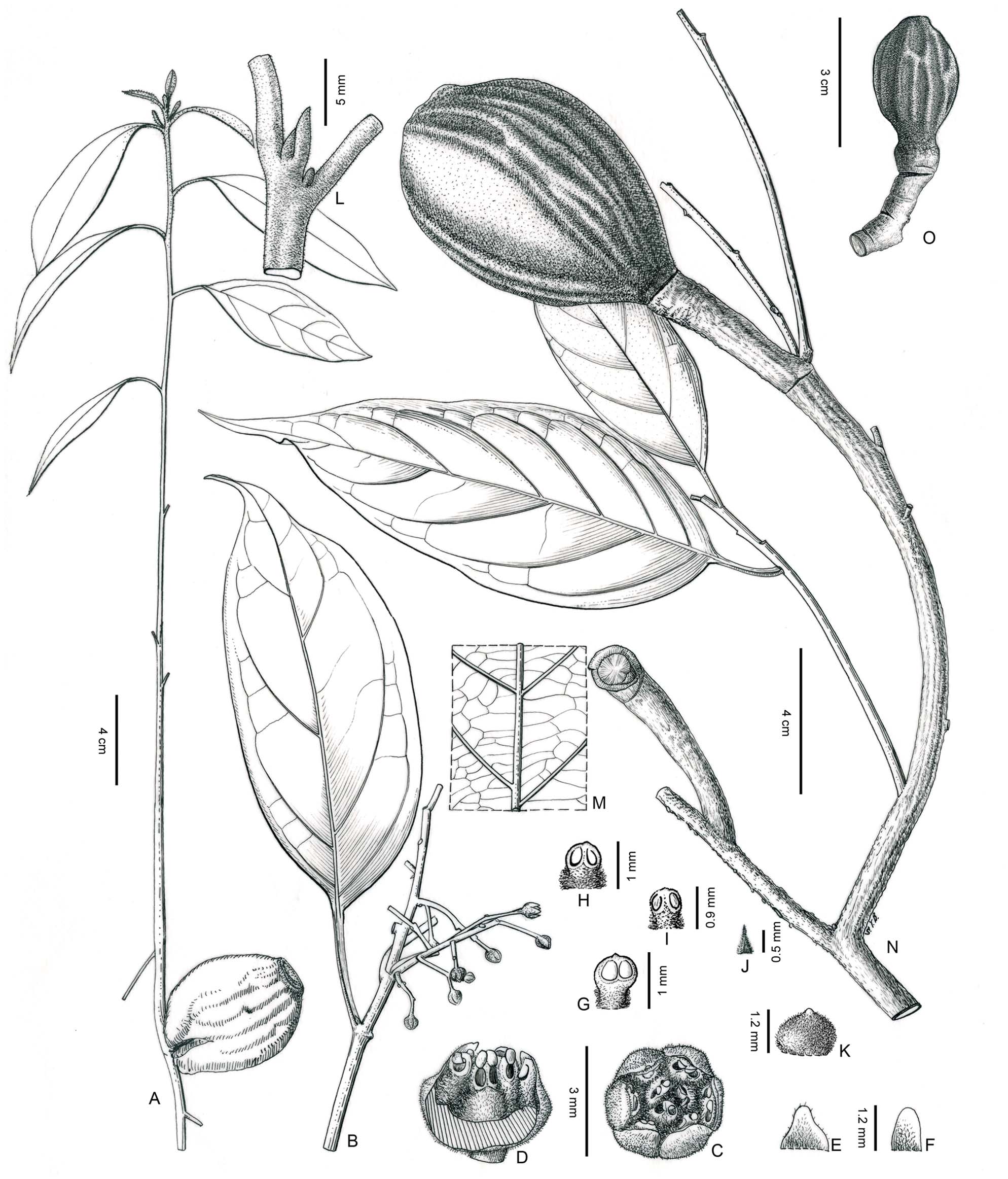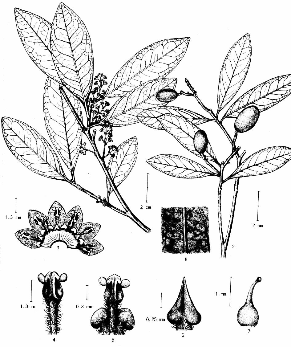 文献:Guihaia 15(3): 209, f. 1 (1995). 形态描述:乔木, 高约 10 m , 小枝略具棱, 干时浅栗色, 芽无毛。叶近对生, 革质, 椭圆形, 稍歪斜, 长 9.0一1 3.5 o m , 宽 2.0一3.5 0 m , 先端渐尖, 尖头略弯, 基部狭楔形, 两面光亮, 中脉上面平坦或微隆起, 下面隆起, 侧脉每边7-9 条, 两面明显, 在边缘网结, 小脉在两面呈网格状, 叶柄长1.0一1.s c m , 无毛。果序长约4 c m ; 果卵状长圆形, 长约1. s o m , 直径约。, 表面光亮, 果柄长1。O一1。4 e m。果期9 月。 分布:Guangxi 性质:新种 |