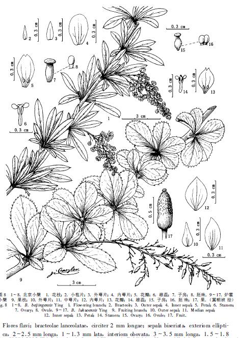 New taxa of Berberis Linn .(Berberidaceae)from China 作者:YING Tsun-Shen 文献:Acta Phytotax. Sin. 37(4): 324 (1999). 形态描述:落叶灌木, 高约1 m 。枝具棱槽, 禾秆黄色或带淡棕褐色, 无毛, 具稀疏黑色疣点;茎刺单生, 偶三分叉, 长5-8mm , 腹面具浅槽, 与枝同色。叶薄纸质, 狭倒披针形, 长1-4 cm , 宽3-6 mm , 先端急尖, 基部渐狭, 上面绿色, 中脉微隆起, 背面淡绿色, 无毛, 不被白粉, 中脉明显隆起, 两面侧脉和网脉明显隆起, 叶缘平展, 全缘;近无柄。圆锥花序具花15~30朵, 长3-7cm , 包括总梗长1-1.5cm , 无毛;苞片披针形, 长2-3.5mm ;花梗长2-5 mm , 光滑无毛;花黄色;小苞片披针形, 长约2 mm ;萼片2 轮, 外萼片椭圆形, 长2-2.5 mm , 宽1-1.3 mm , 内萼片倒卵形, 长3-3.5 mm , 宽1.5-1.8 mm ;花瓣椭圆形, 长3-3.2 mm , 宽1.2-1.5 mm , 先端全缘或微缺裂, 基部楔形, 具2 枚分离腺体;雄蕊长约2.1 mm , 药隔不延伸, 先端平截;胚珠单生, 具柄。果未见。花期5-6 月。 分布:Beijing: West Hill 性质:新种 |