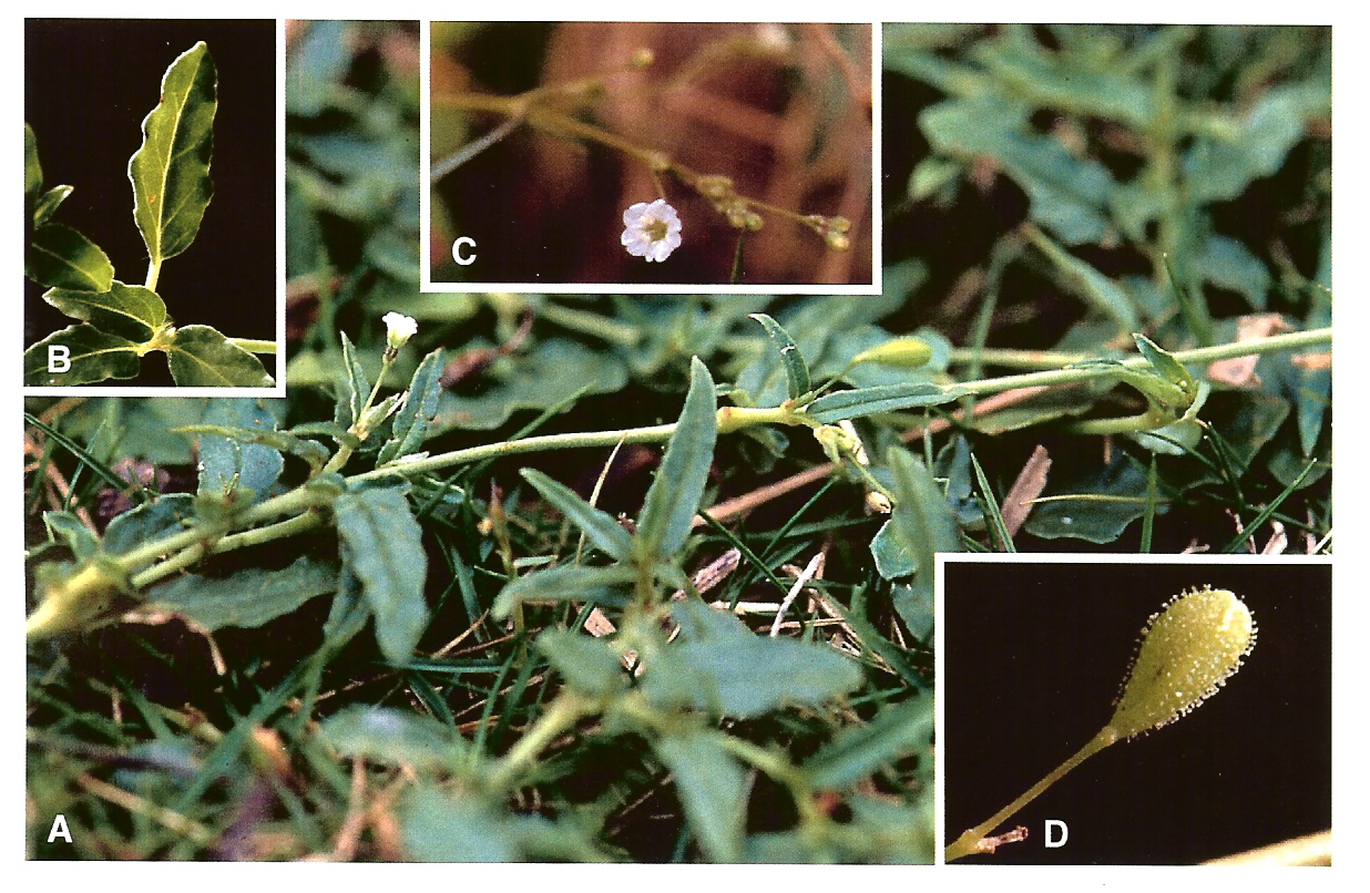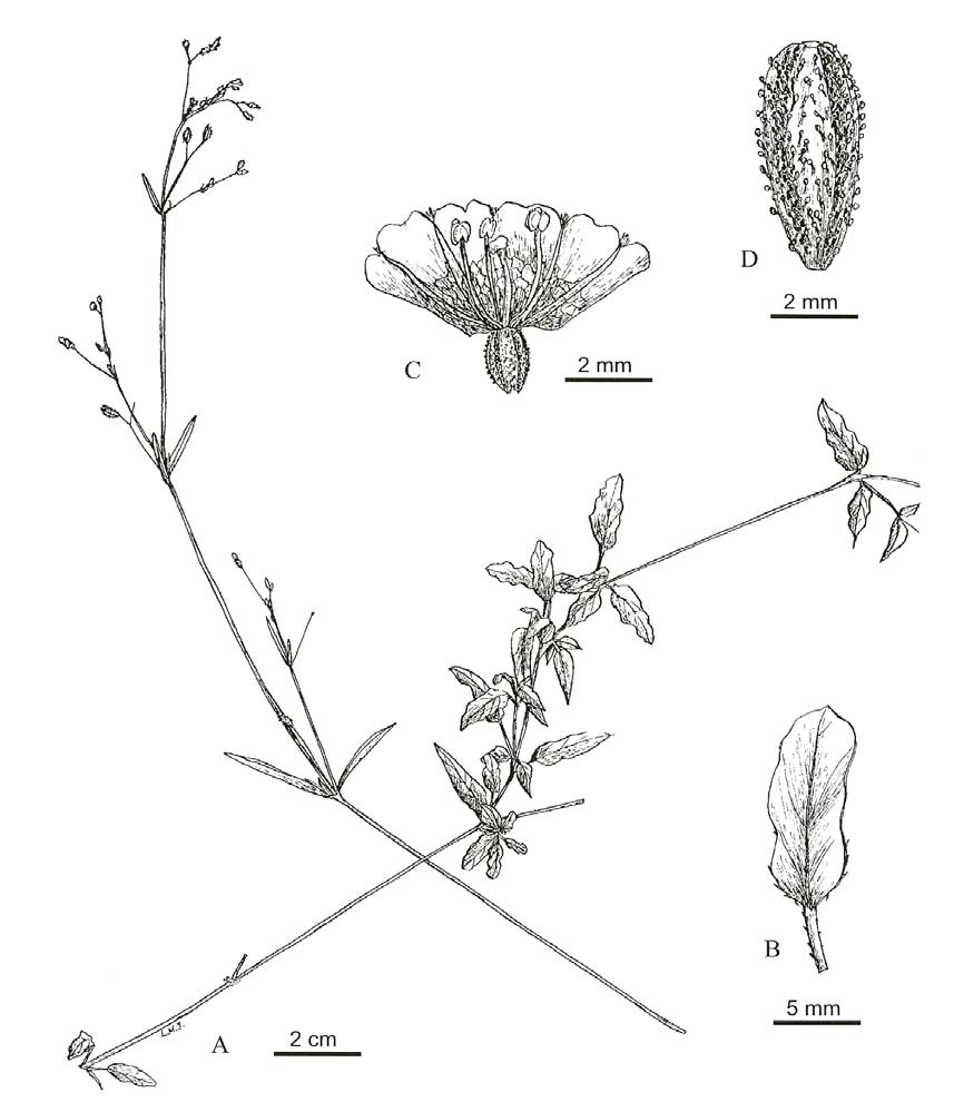 A Taxonomical Study of the Genus Boerhavia (Nyctaginaceae) in Taiwan 作者:Shih-Huei Chen, Ming-Jou Wu 文献:Taiwania 52(4): 337 (2007). 形态描述:Herba perennis, prostrata, cum pilis glanduliferis sparsis; folia lanceolata, longe petiolata; laminaecrispata, 1-2.5 m longa; inflorescentia axillaris et terminalis; pedunculus filiformis, 0.5-2 cm longis;flos solitarius; stamina 2 vel 3; fructus obovatus, 4-5 mm longus, glandulus. 分布:Taiwan: Hualien Co., Chi-hsin-tan 性质:新种 |