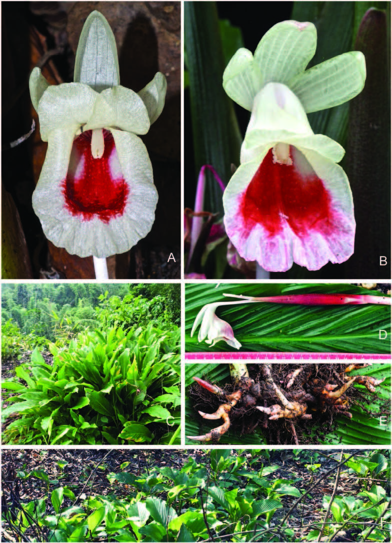 The history and identity of Boesenbergia longiflora (Zingiberaceae) and descriptions of five related new taxa 作者:John D. Mood, Linda M. Prince, J.F. Veldkamp, Santanu Dey 文献:Gard. Bull. Singapore 65(1): 76. 2013. 形态描述:Deciduous herb up to c. 1 m tall; rhizomes numerous, horizontal runners of variable length, multiple nodes, c. 0.51.5 cm diam., pink or red when young, orange or red when mature, internally yellow to orange; tuberous roots few, elongate c. 6 × 0.3 cm, orange or white externally and internally, root hairs few, short, thin, white. Pseudostems many, up to 30 cm, composed of leaf sheaths, base oval, c. 2.5 cm diam., 12 short, leafless sheaths at the base, leaf sheaths longitudinally ridged, cross-hatched, reddish or green, glabrous, margin hyaline. Leaves 37 per pseudostem; petiole 1115 cm, deeply channelled, green or red, glabrous; ligule slightly bilobed, an extension of the hyaline margin, 4 mm long, white, translucent, glabrous; lamina elliptical 4045 × 1516 cm, ventrally dark green, glabrous, dorsally lighter green, glabrous with a few hairs on the midrib, base rounded to cordate, apex acute to attenuate. Inflorescence radical, c. 310 per pseudostem, up 18 cm long (including peduncle) produced from the top of the horizontal rhizome near the pseudostem, peduncle 13 × 0.51 cm, white or pink, glabrous, basal sheaths 12, 46 × 1.52 cm, white; spike cylindrical, slightly asymmetric, 1114 × 11.5 cm. Bracts linear to cymbiform, 45, c. 611 × 1.52 cm, distichously arranged, white, green or red, glabrous, surface veined, each bract enclosing one flower, apex acute; bracteole lanceolate, c. 56 × 0.5 cm, white, translucent, glabrous, open to the base, apex 2-dentate. Flowers 45 per inflorescence, up to c. 20 cm long. Calyx tubular, 22.3 × 0.5 cm, white, translucent, glabrous, apex tri-dentate. Floral tube c. 1015 cm long, c. 0.30.4 cm wide at the base, white, tinged or striped pink, glabrous externally and internally, corolla lobes (dorsal and ventral) oblong, c. 3.84 × 1.4 cm, creamy-white, glabrous, margins involute; androecial tube cup-shaped, c. 1012 mm long, c. 13 mm diam. at the top, white, glabrous externally and internally. Labellum slightly saccate, elongate, 56 cm long, c. 4 cm wide (when flattened at the broadest point) white to creamy-white, throat centre bright red, maculate with white showing through as dots, lip creamy-white, abaxial surface with a few glandular hairs, margin undulate, wrinkled, apex entire; lateral staminodes obovate, 2.5 × 1.5 cm, creamy-white, abaxial surface with few glandular hairs, apex rounded, revolute. Stamen 12 mm long, filament 34 mm long, 23 mm wide at the base, white, glabrous, anther 89 mm long, 3 mm wide (first day) then c. 5 mm wide (thecae diverging on the second day) apex slightly bilobed with no anther crest, thecae 9 × 1 mm, white, dehiscing along the entire length. Ovary c. 7 × 3 mm, trilocular, axile placentation, white, glabrous; style filiform, white, glabrous, stigma elongate, white, ostiole vertically rectangular, without cilia, exuding a sticky liquid on the second day; epigynous glands narrowly ovate, two, 8 mm long, white. Fruit not seen. (Measurements based on living, cultivated material of M3074). 分布:Thailand (Indo-China, Asia-Tropical); Bangladesh (Indian Subcontinent, Asia-Tropical); Myanmar (Indo-China, Asia-Tropical); Yunnan; Sikkim (East Himalaya, Indian Subcontinent, Asia-Tropical); Assam (Indian Subcontin 性质:sp. nov. |