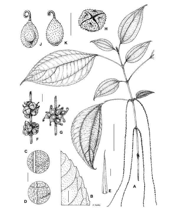 New Species in Old World Boehmeria (Urticaceae) 作者:C. M. WILMOT-DEAR, I. FRIIS, Z. THOMAS 文献:Edinburgh J. Bot. 67(3): 441 (-444; fig. 4, map). 2010. 形态描述:Shrub 2-4 m tall; ultimate branches 1-15 mm diameter, glabrous, drying red-brown. Stipules lanceolate, 4-7 3 1-1.5 mm, rather thick-chartaceous, glabrous. Leaves opposite, very variable, slightly or moderately dimorphic in size only; petiole hairy (as for lamina), drying red tinged, relatively long, 0.3-0.5 3 lamina length in ‘larger’ leaf of each anisomorphic pair, much shorter (often only 0.1 3 lamina length) in ‘smaller’ leaf; ‘larger’ lamina 1.3-1.7(-2.7) 3 length of ‘smaller’ lamina, 6 symmetrical or with one side slightly broader than other, mostly elliptic (on some plants also a few elliptic-ovate), medium to large, ‘larger’ leaf 13-18 3 5-7 cm, 2.1-2.8 3 as long as wide; margin shallowly broadly crenate to bluntly serrate, with 30-35 teeth up to 0.7 mm deep and 5-8 mm broad, these either visible throughout length or progressively shallower towards base and only discernible in upper 2/3 of margin; leaf apex short-attenuate to indistinctly or abruptly short-acuminate, base slightly asymmetrically short-cuneate; basal veins extending to distal 1/3 of lamina or on one side almost to tip, distal lateral veins 2(-3), lowermost lateral vein on narrower side arising near middle, on other side in distal 1/3, veins slender, inconspicuous adaxially, fine-prominent abaxially, coarser tertiary venation 6 scalariform, fine-prominent abaxially; membranous or very thin-chartaceous, both surfaces green when living but drying consistently dark brownish-black adaxially and lighter brown abaxially, with veins red tinged, adaxial surface 6 shiny (said to be sticky when live-Yahara, 1981), sparsely hairy with hairs minute (, 0.2 mm long), adpressed; abaxial surface with sparse hairs which are even smaller, finer and often 6 spreading. Inflorescences consisting of flower clusters borne along specialised, 6 pendulous, very slender leafless axes, 10-50 cm long, axes unbranched; bracts subtending clusters minute, inconspicuous, 1-1.5 mm long and wide; clusters well spaced, 2-. 5 mm apart, most clusters with both sexes, clusters small, 1.5-2 mm diameter, with few-10(-15) flowers; bracts subtending flowers minute and inconspicuous,, 1 3 0.2 mm. Male flowers 4-merous with pedicels up to 0.5 mm long, mature buds depressed-globose, 1.2-1.5 mm diameter with conspicuous dorsal thickening on each lobe, with sparse fine hairs (as for leaves). Female flowers up to 0.5 mm long, stigma often minute down-curved, 0.3-1.5 mm. Fruiting perianth only 0.7-0.9 3 0.5-0.7 mm, very broadly ovoid or ellipsoid with minute beak, markedly dorsiventrally flattened with marginal ridge or narrow thick-textured wing, sparsely short-hairy, hairs 6 spreading. Achene filling most of perianth, forming a central bulge when seen from the outside. 分布:Thailand (Indo-China, Asia-Tropical); Yunnan; Sumatera (Malesia, Asia-Tropical) 性质:sp. nov. |